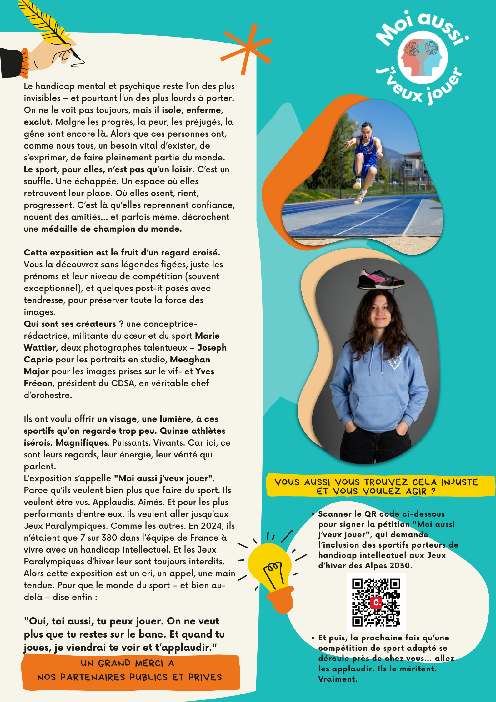 Cette exposition s’inscrit dans un programme global de sensibilisation au sport adapté mené par le CDSA et le CDOS de l’Isère, avec le soutien d’entreprises engagées. Un QR code est disponible sur le lieu d’exposition pour signer la pétition « Moi aussi j’veux jouer », en faveur de l’inclusion des personnes avec un handicap intellectuel aux Jeux Paralympiques d’hiver 2030.